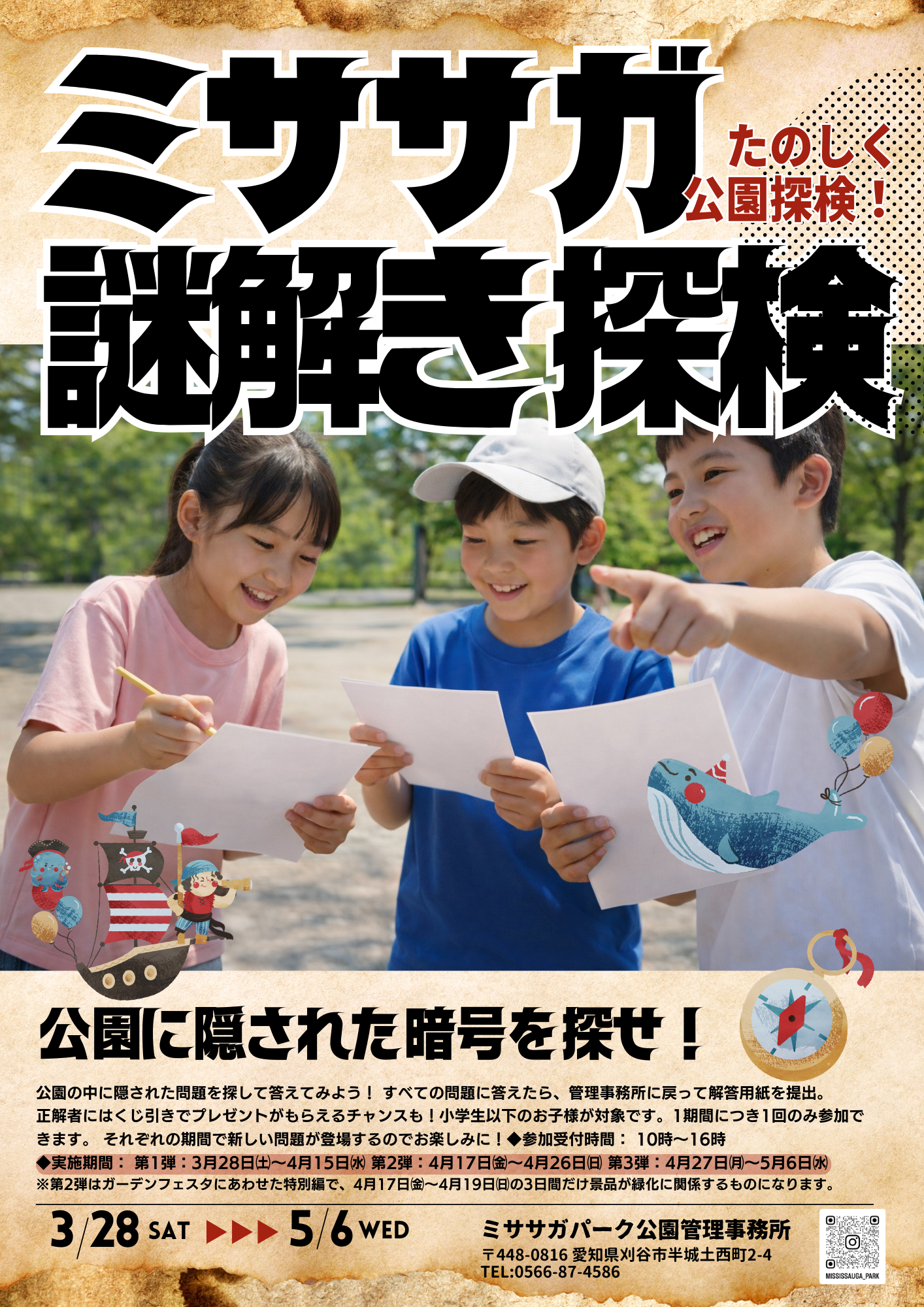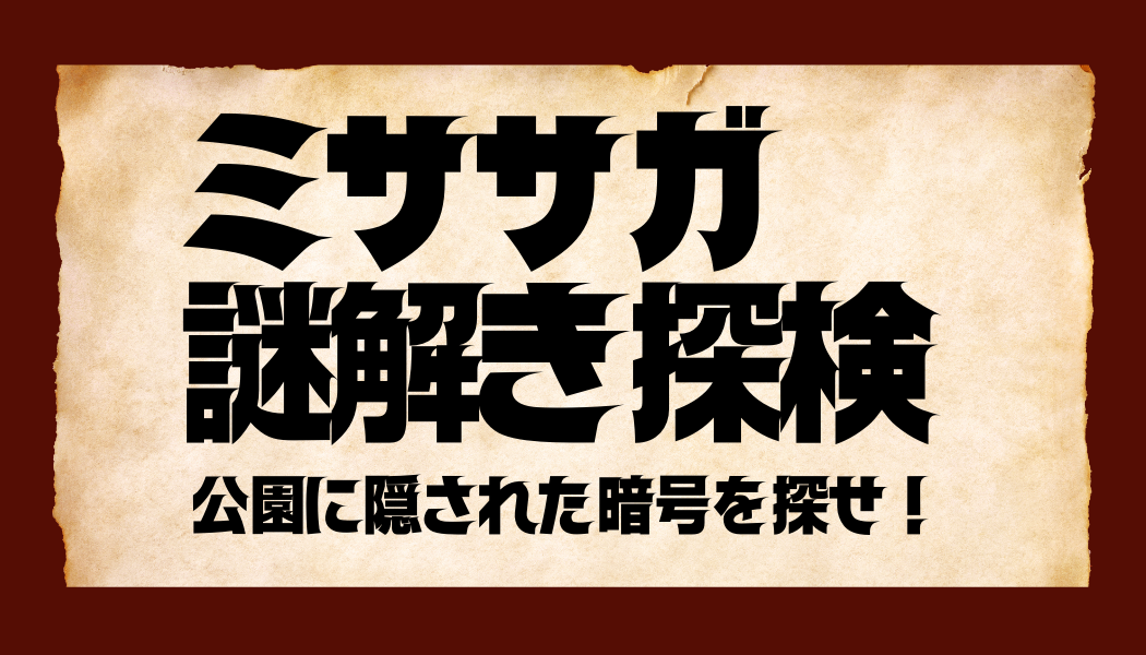 公園内に隠された問題を探して、答えよう!全問正解したら、公園管理事務所でくじ引きに挑戦できるよ!くじ引きで景品や参加賞がもらえるチャンス!